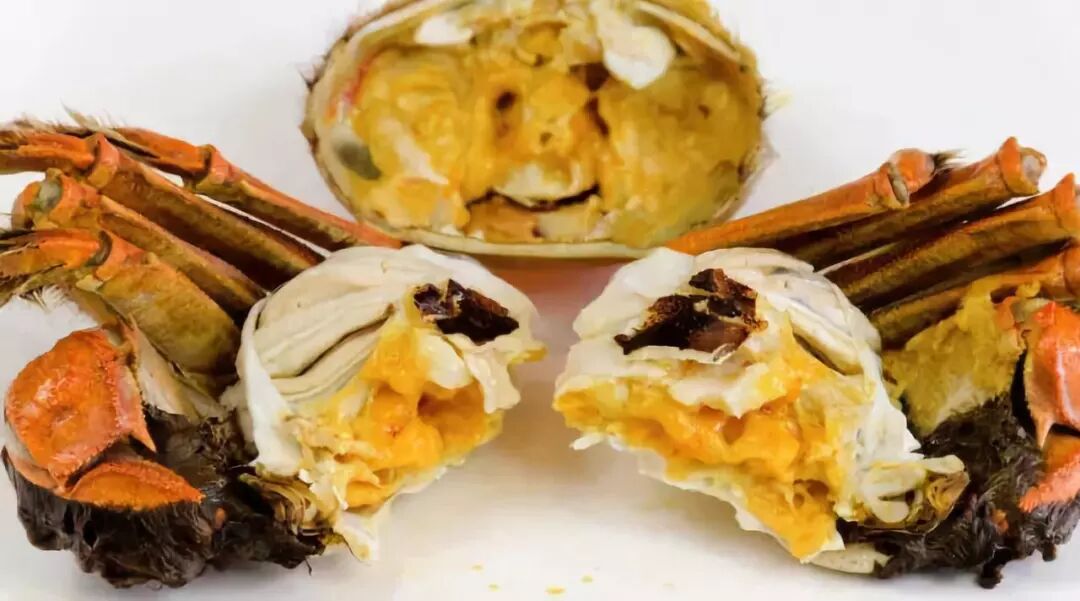 蟹黄是母蟹的特色,颜色橘红,口感偏硬,是雌性的卵巢。